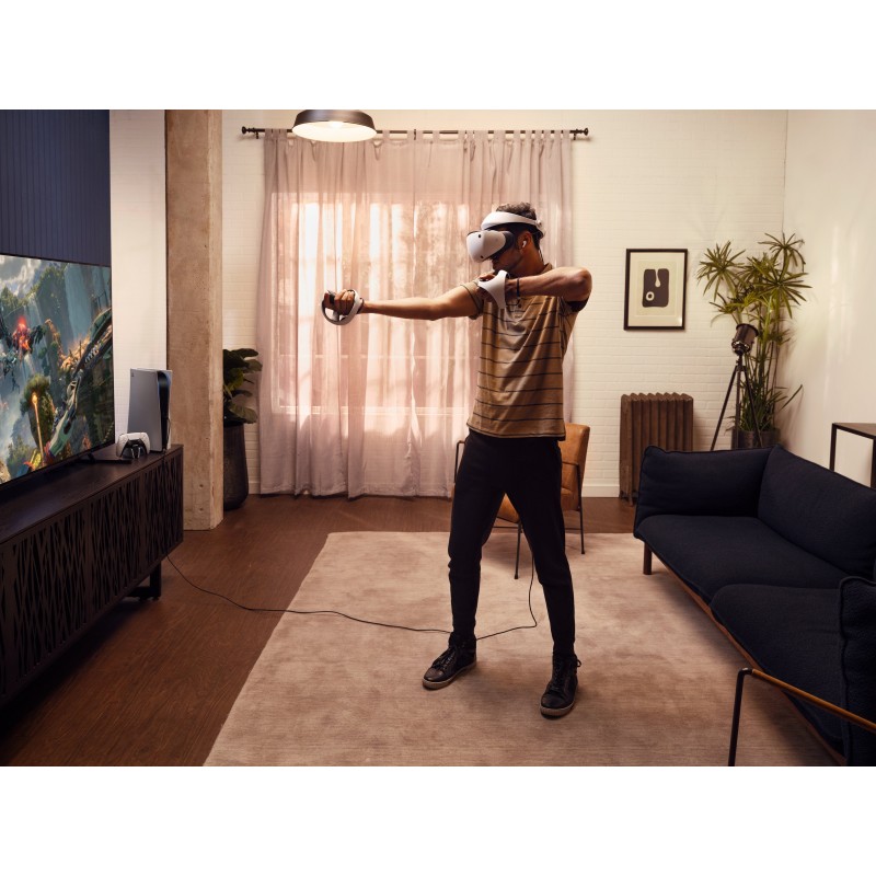 Просто підключіть кабель USB до консолі PS5 – і все готово. Звільніть ігрову зону від предметів, запустіть гру, насолоджуйтесь матеріалами, створеними не для віртуальної реальності, у кінематографічному режимі або дізнайтеся, що відбувається в реальному світі, одним натисканням функції наскрізного огляду.