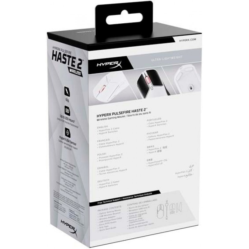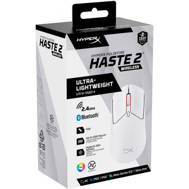 Також HyperX створили високопродуктивний набір компонентів, серед яких виділяється високоточний датчик HyperX 26K, що має власну роздільну здатність до 26 000 точок на дюйм зі швидкістю відстеження до 650 IPS (16,5 м/с). Pulsefire Haste 2 Wireless оснащена фірмовими перемикачами HyperX, які забезпечують тактильний і звуковий зворотний зв'язок на кожне приємне натискання і розраховані на термін служби до 100 мільйонів натискань. Ви також насолоджуватиметеся чудовим фізичним контролем над мишею завдяки накладкам, що входять до комплекту, надгнучкому паракордовому кабелю та глайдам з чистого тефлону. Отримайте максимальну віддачу від кожного руху миші з програмним забезпеченням HyperX NGENUITY: створюйте макроси для 6 програмованих кнопок, налаштовуйте параметри DPI та персоналізуйте RGB-підсвітлення.
