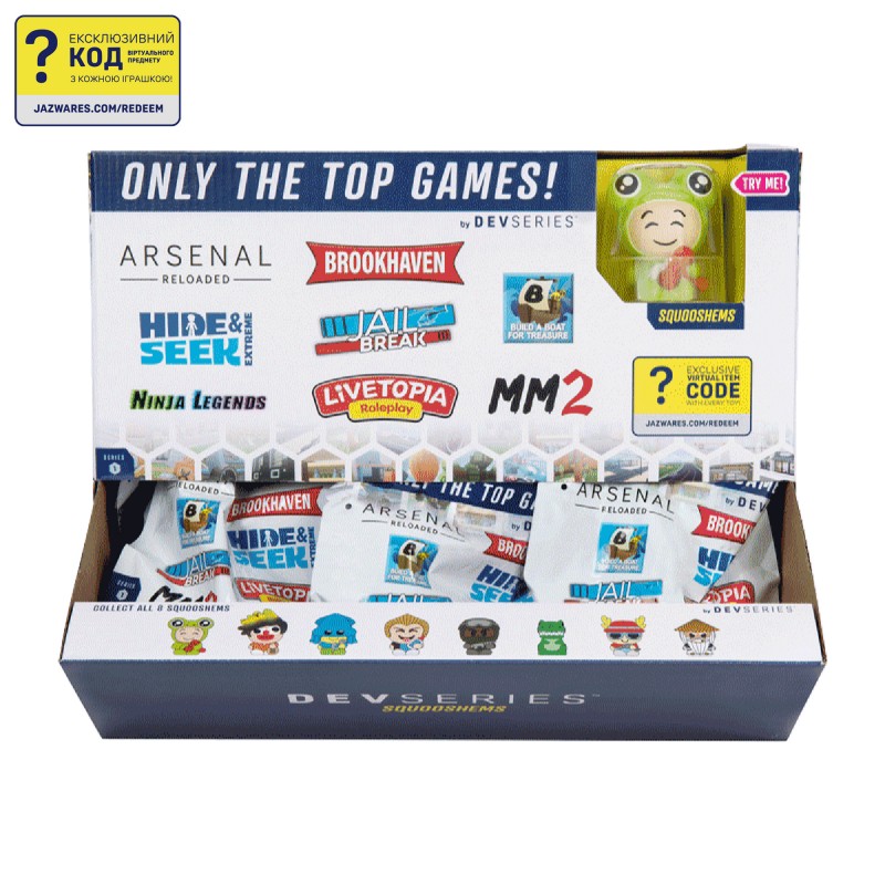 Кожен Squooshems виготовлено з м’якого матеріалу, який при стисканні змінює форму, що робить його ідеальним компаньйоном під час гри, або стане прикрасою вашого столу, книжкової полиці або ліжка. Також ігрові фігурки-сквіші у комплекті мають ексклюзивний віртуальний код предмета, який відкриває унікальний аксесуар для вашого Roblox аватара, доступний лише у DevSeries. Зберіть усі вісім улюблених персонажів Squooshem від DevSeries. Офіційно ліцензований продукт від Jazwares.