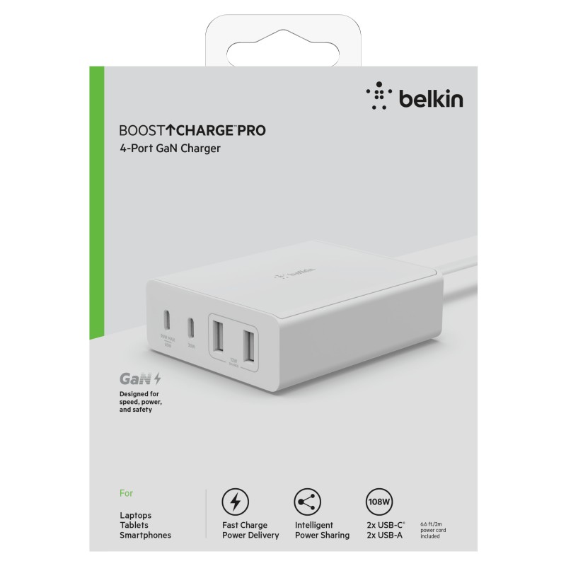 • Забезпечує максимальну загальну потужність заряджання 108 Вт при використанні одного порту USB-C (96 Вт) та загальних портів USB-A (12 Вт). Інтелектуальний розподіл потужності розпізнає потребу до 4 підключених пристроїв.