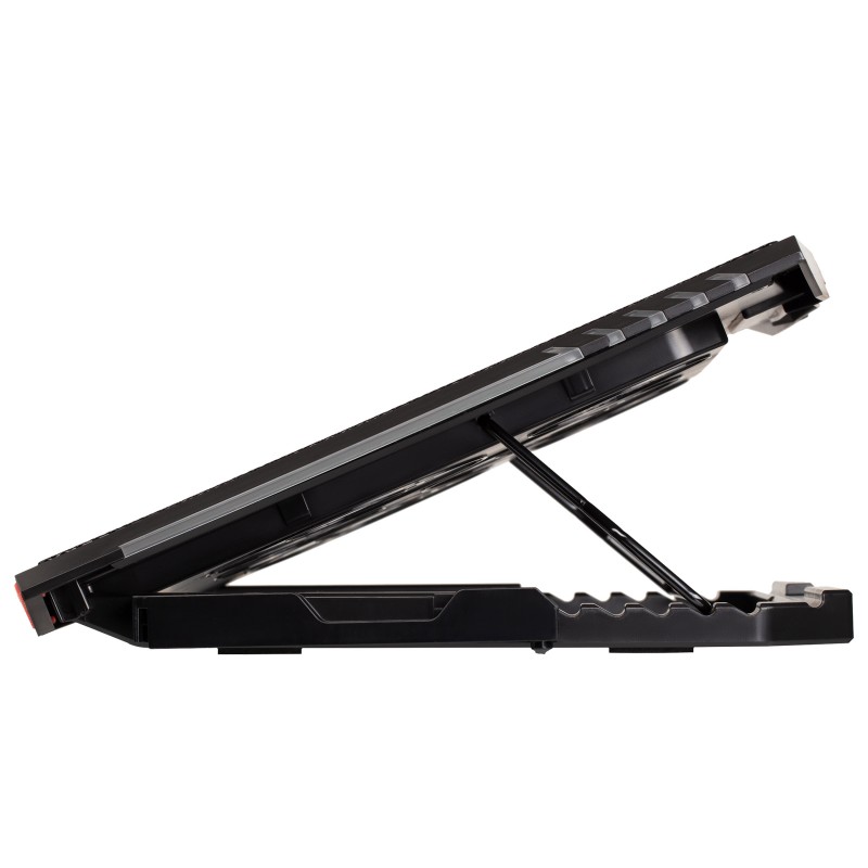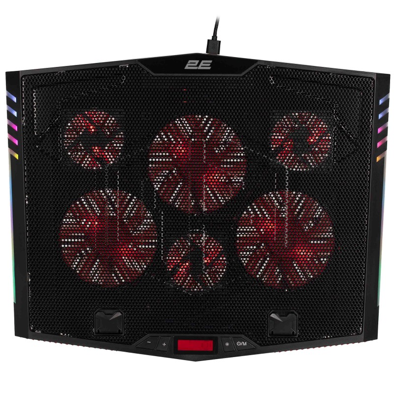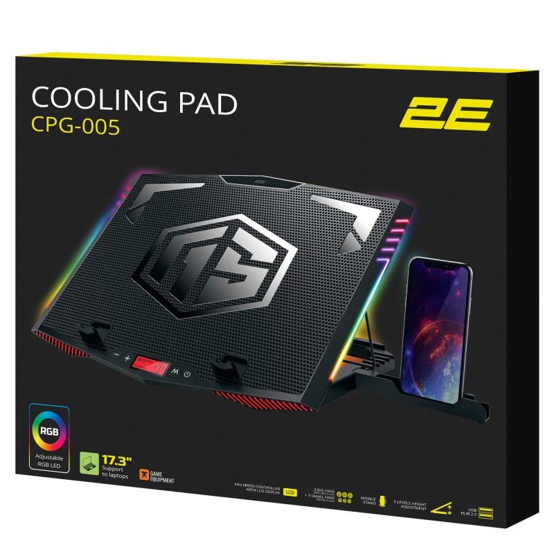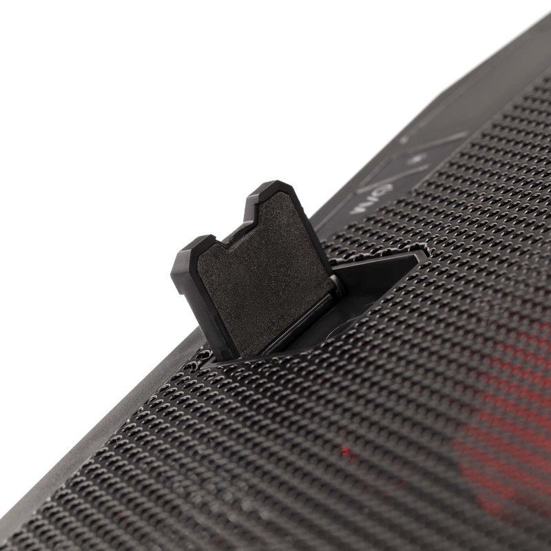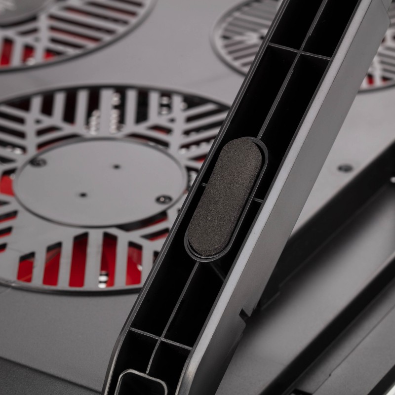 Додатково 6 вентиляторів, LCD-дисплей, 7 рівнів регулювання RGB-підсвічування, тримач для смартфона, прогумовані ніжки, прогумовані холдери для фіксації ноутбука