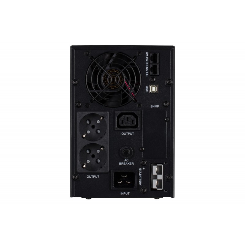 Вхід 165 ~ 300 В змінного струму, на виході «чиста» синусоїда 220/230/240 В (можливість налаштування напруги). Дві розетки Schuko + 1 розетка IEC C13, кабель живлення, кабель для підключення зовнішніх АКБ, розніми USB та RJ45. На передній панелі вбудовано LCD-дисплей, на якому відображається стан роботи пристрою, зокрема коди помилок. Можливість підключення SNMP адаптера.
