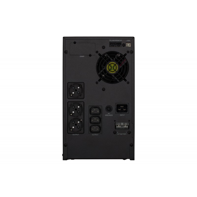 Вхід 165 ~ 300 В змінного струму, на виході «чиста» синусоїда 220/230/240 В (можливість налаштування напруги). Три розетки Schuko + три розетки IEC C13, кабель живлення, кабель для підключення зовнішніх АКБ, розніми USB та RJ45. На передній панелі вбудовано LCD-дисплей, на якому відображається стан роботи пристрою, зокрема коди помилок. Можливість підключення SNMP-адаптера.