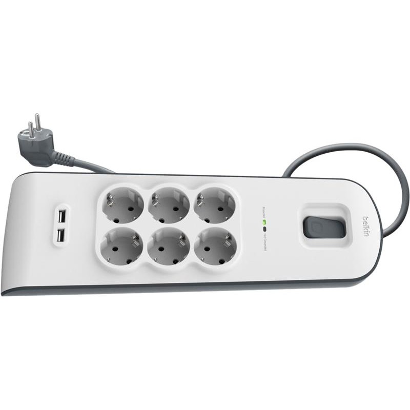 Belkin Мережевий фільтр з захистом від перенапруги, 6 роз., 2xUSB 2.4A, 650 Дж, UL 500 В, кабель 2м