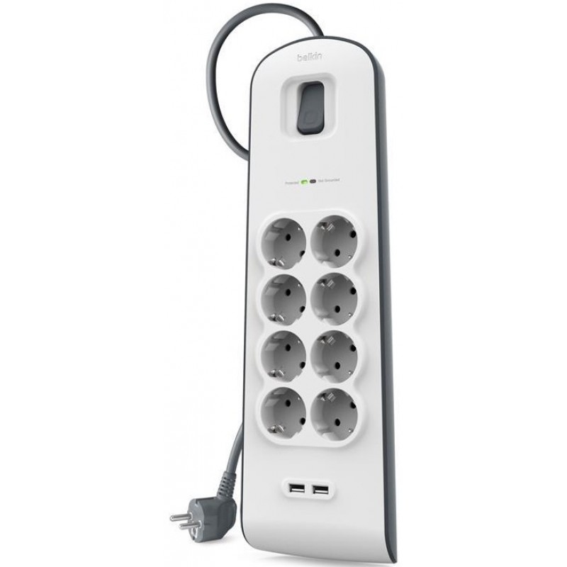 Belkin Подовжувач-фільтр мережевий 8хТип F, 3x1.5мм кв, 16А, 2xUSB-A 2.4A, з захистом від перенапруги, 2м, білий