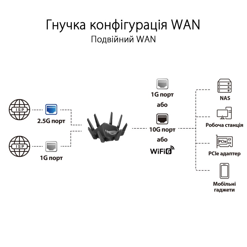 ROG Rapture GT-AXE16000 пропонує пару портів 10G Ethernet з подвійною функцією (локальне або інтернет-підключення), чотири порти Gigabit Ethernet та один інтернет-порт 2.5G Ethernet. Це дає вам гнучкість вибору: надати максимальну пропускну здатність підключеним пристроям або ж скористатися перевагами супершвидкісного підключення до Інтернету.