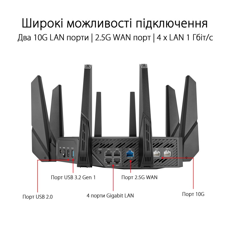 ASUS Маршрутизатор GT-AXE16000 Wi-Fi 6E 4xGE LAN 1x2.5GE WAN 2x10GE LAN/WAN 1xUSB3.2 1xUSB2.0 MU-MIMO OFDMA MESH gaming