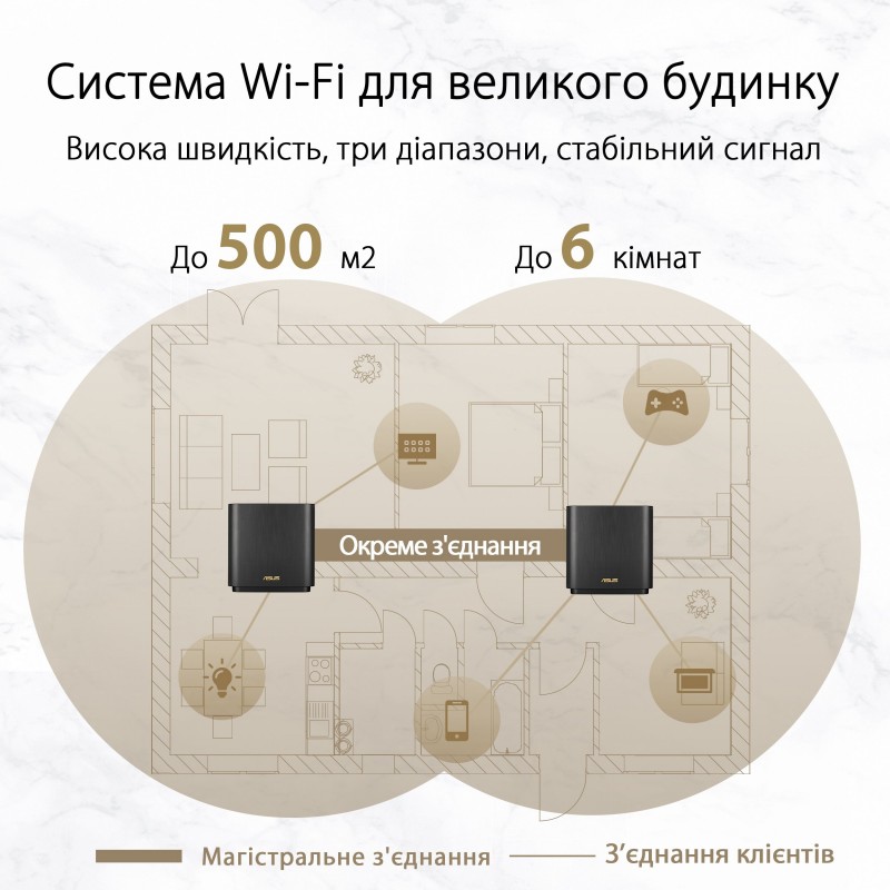 Стандарт Wi-Fi 6 повністю сумісний із попередніми, тому до системи ZenWiFi AX можна без проблем підключати пристрої, сумісні з більш ранніми стандартами, як-от 802.11ac, 802.11n тощо.