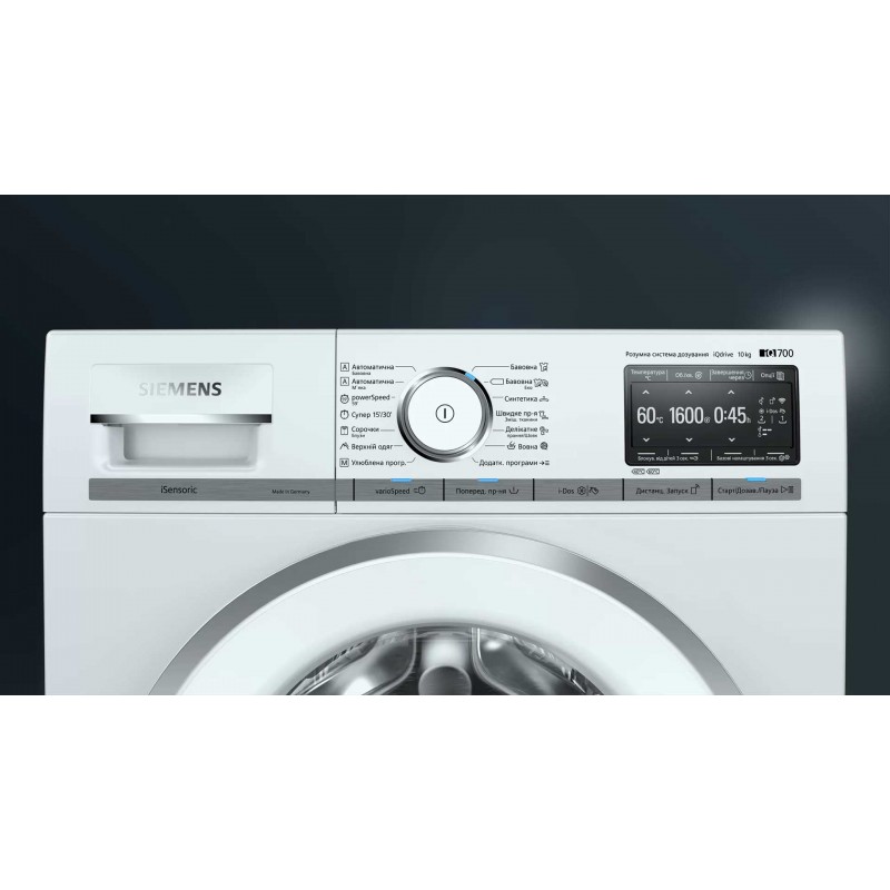 Автоматичне зважування білизни, Автоматичне розпізнавання піни у воді та запуск додаткового ополіскування, Циркуляційний сенсор для контролю оптимальних витрат води, Технологія waterPerfect Plus: неймовірно ощадливе споживання води з найкращим результатом прання, Спеціальні антивібраційні смуги на бічних стінках приладу, Інтелектуальна система i-Dos: автоматичне дозування миючих засобів і кондиціонера, Індикація передозування білизни, Блокування від дітей, Сенсорні кнопки TouchControl, Сенсор брудної води AquaSensor, Можливе встановлення під стільницю або в нішу, Програмний перемикач із підсвічуванням і електронним режимом, Індикація кількості споживаної води та енергії перед стартом програми, Функція дозавантаження білизни |
