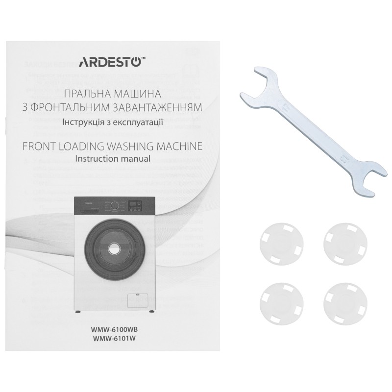 У комплекті з пральною машиною надається інструкція з експлуатації з гарантійним талоном, енергетична етикетка, мікрофіша, шланг подавання води, гайковий ключ і захисні кришки болтів для транспортування. Фактичний розмір ARDESTO WMW-6100WB становить 598 × 445 × 845 мм за ваги 47 кг.