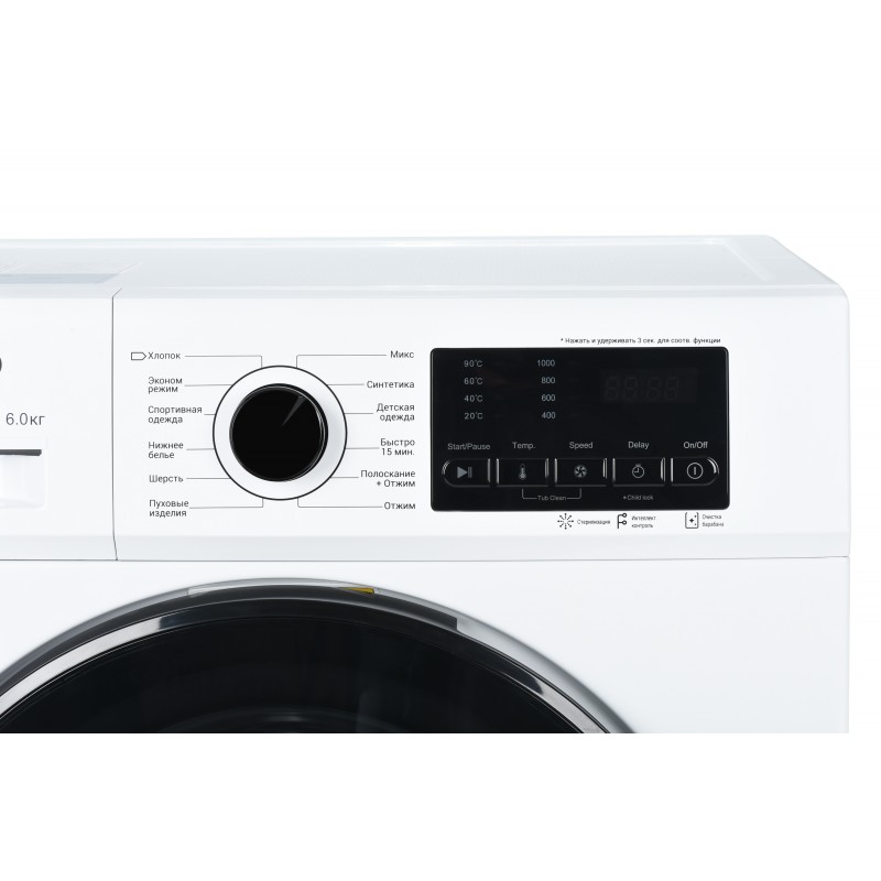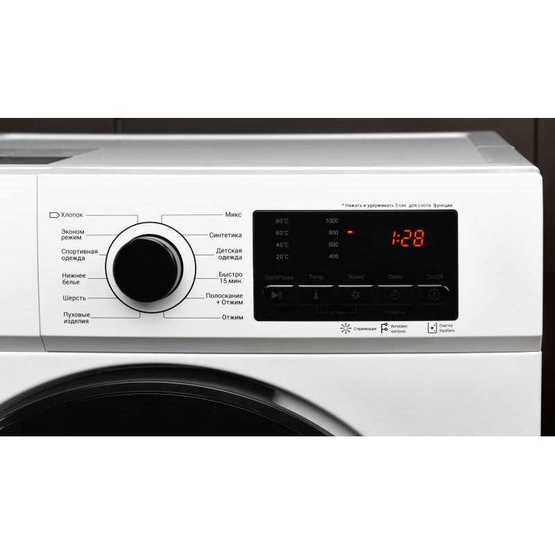 Вибір температури води – 20°C, 40°C, 60°C, 90°C. Присутні режими відкладеного прання, очищення барабана та функція блокування від дітей. Стерилізація барабана здійснюється водою з температурою близької до кипіння.