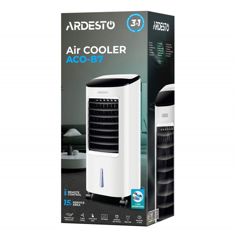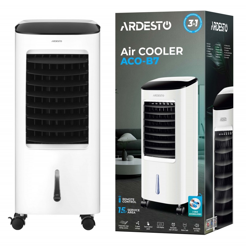 ARDESTO Охолоджувач повітря ACO-B7 3в1 охолоджувач-зволожувач-вентилятор, 15 м2, ел. кер-ня, резервуар 7 л., 430 м3/год, дисплей, таймер, авто вим-ня, пульт дк, біл/чорн