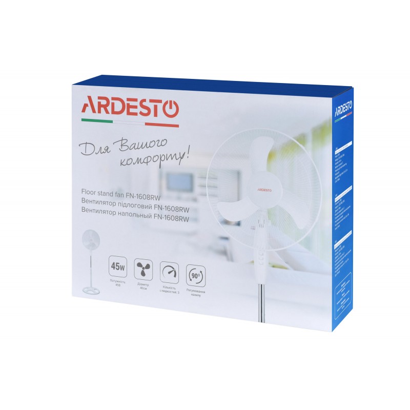 Механічне керування реалізовано за допомогою чотирьох клавіш. Потужність вентилятора – 45 Вт, передбачено три швидкості роботи. Функція обертання забезпечує рівномірний розподіл повітряних потоків в приміщенні.