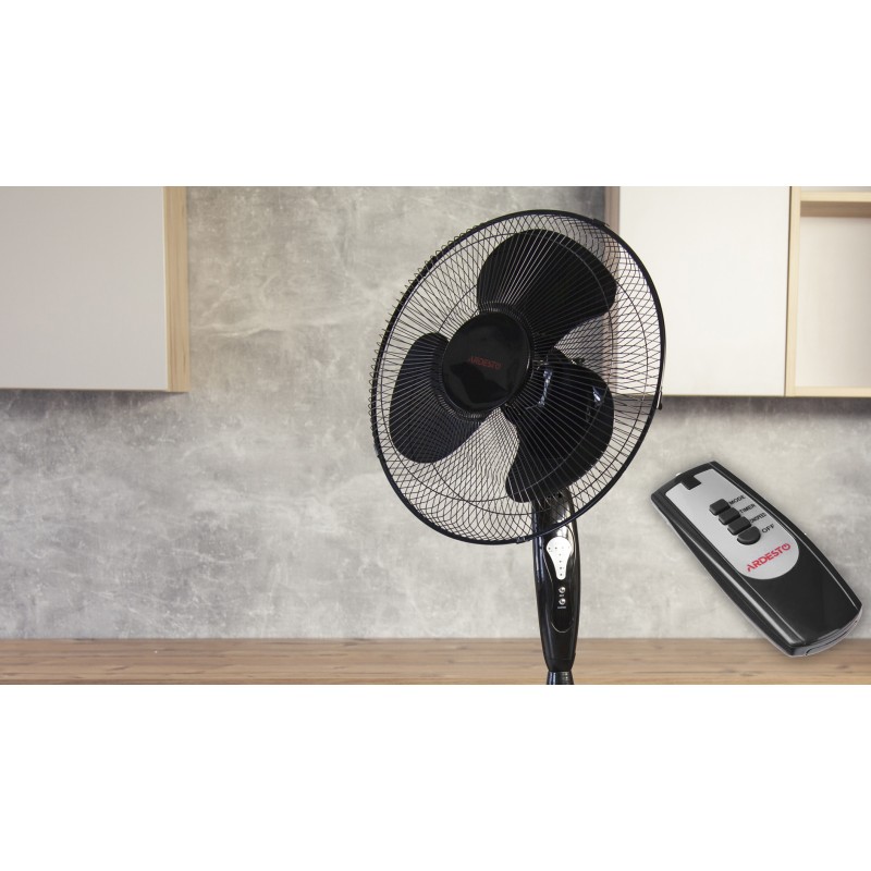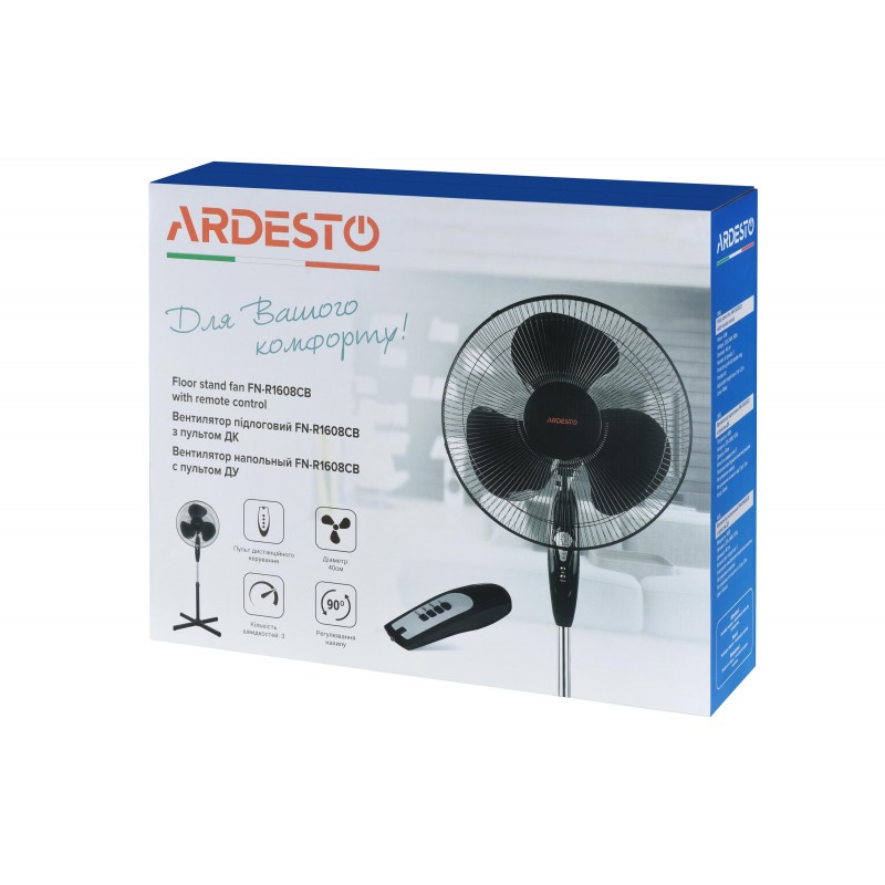 Механічне керування реалізовано за допомогою двох клавіш, для дистанційного керування є пульт з чотирма кнопками. Потужність вентилятора – 45 Вт, є три швидкості, таймер і два режими роботи – постійний і періодичний. Функція обертання забезпечує рівномірний розподіл повітряних потоків в приміщенні.