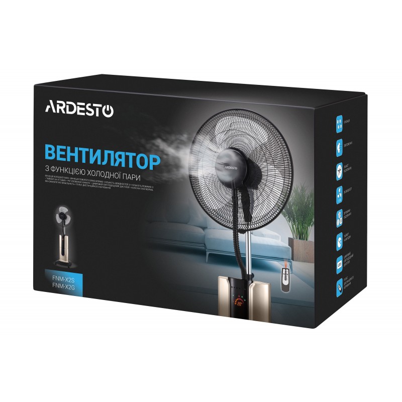 Для керування Ardesto FNM-X2G передбачено п’ять клавіш та LED-дисплей на пристрої, а також зручний пульт ДУ. Потужність вентилятора – 100 Вт, є три швидкості, індикатор температури, таймер на 9 годин і три режими роботи – Normal з регулюванням швидкості, Natural з імітацією природного вітру та Sleeping з м’якою зміною інтенсивності роботи. Функція обертання забезпечує рівномірний розподіл повітряних потоків в приміщенні. Вентилятор встановлюється на платформі з колесами – це забезпечує стійкість та можливість зручного транспортування.