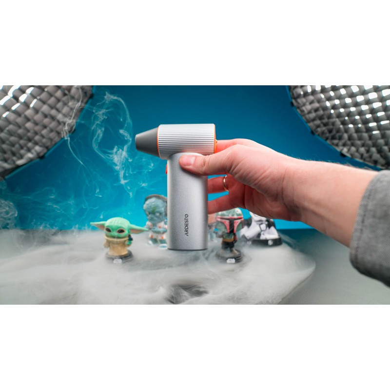 Завдяки трьом режимам швидкості вентилятор може працювати як звичайний ручний охолоджувач у спекотні дні або перетворитися на повітряний компресор для очищення і обслуговування техніки. Потік повітря до 45 м/с за максимальної швидкості обертання лопатей дає змогу легко видаляти дрібний пил, краплі води чи навіть надувати гумові вироби.