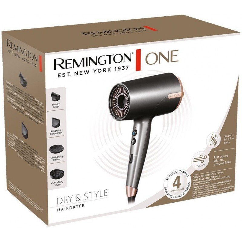 Remington Фен ONE, 2000Вт, 8 режимів, дифузор,чохол,іоніз-я, хол. обдув, термо-сенсор, сірий