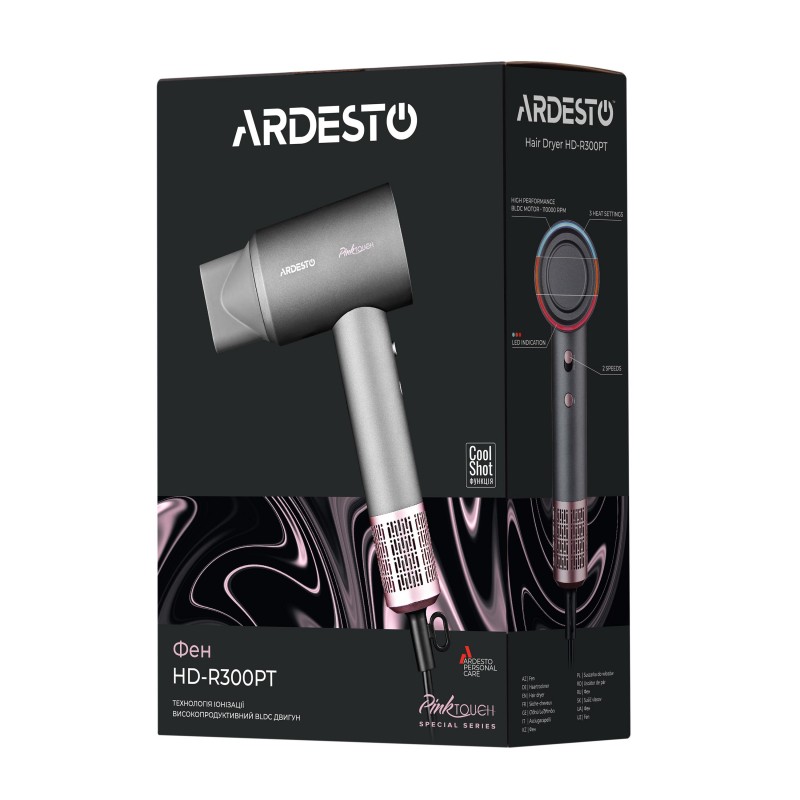 ARDESTO Фен Pink Touch, 1600Вт, 2 швидкості, 3темп.режими, іонізація, дифузор, магнітні насадки, сірий+рожевий