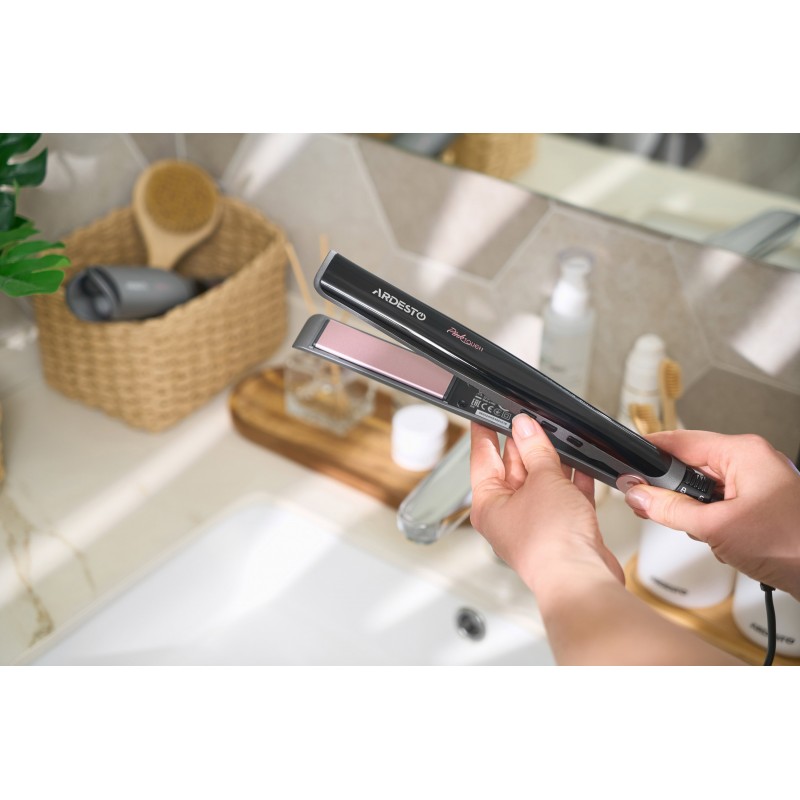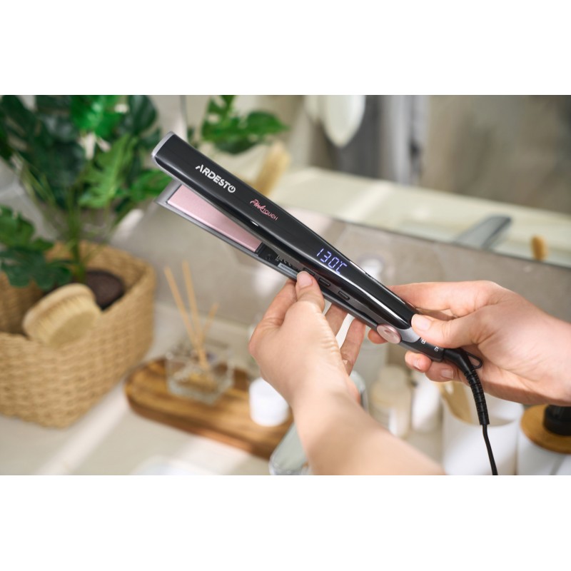 Нагрівальні пластини з керамічним покриттям розміром 86 × 24,5 мм рівномірно розподіляють тепло, залишаючи волосся гладеньким і блискучим без пошкодження. Висока швидкість нагрівання – до 200 °C за 3 хв – зумовлює можливість швидко розпочати укладання.