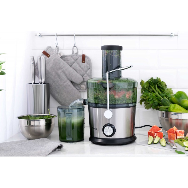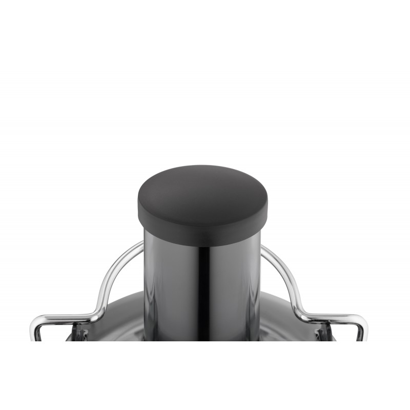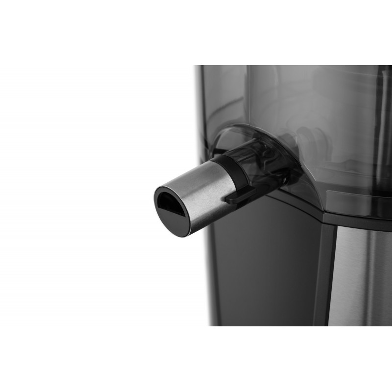 Корпус із нержавіючої сталі з чорними пластиковими елементами приховує малошумний двигун потужністю 1100 Вт. Задля зручності закладання плодів передбачено завантажувальний отвір діаметром 75 мм. Також доступно регулювання швидкості – два режими, тож підібрати оптимальний для різних видів плодів надзвичайно просто. Отримання натурального соку, що не окислюється під час вичавлення, забезпечують високоефективна тертка й фільтр із нержавіючої сталі.