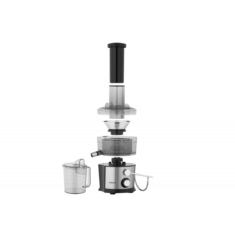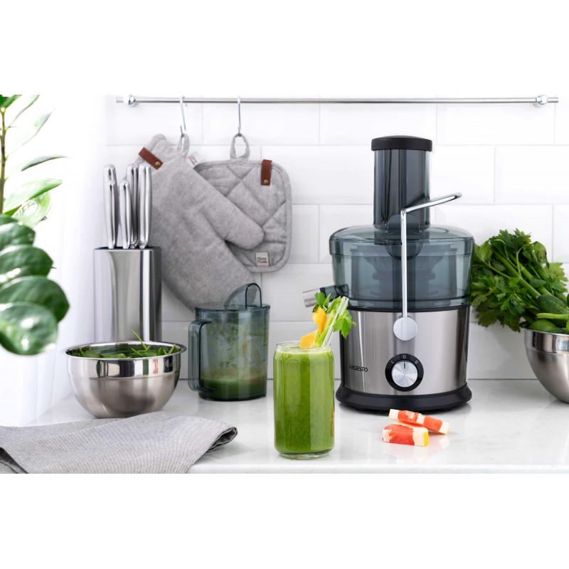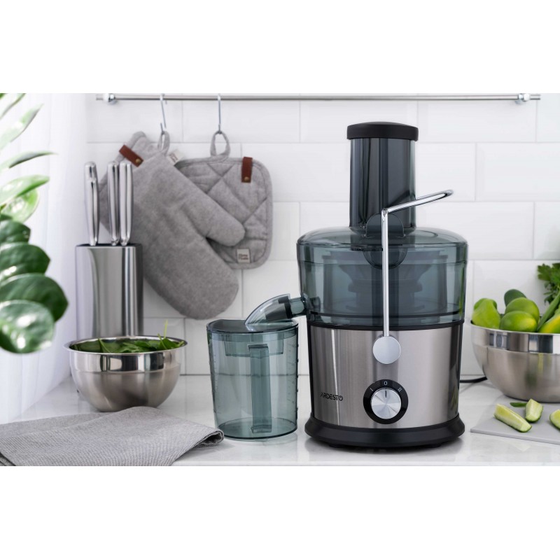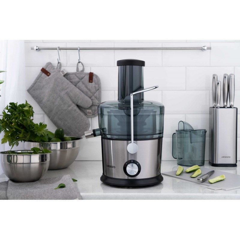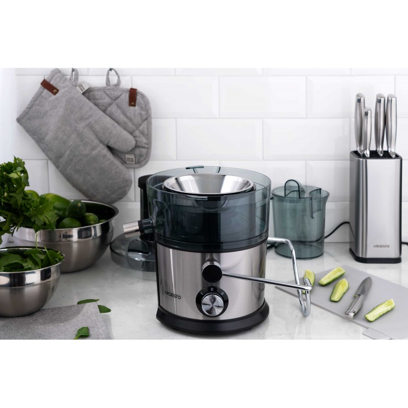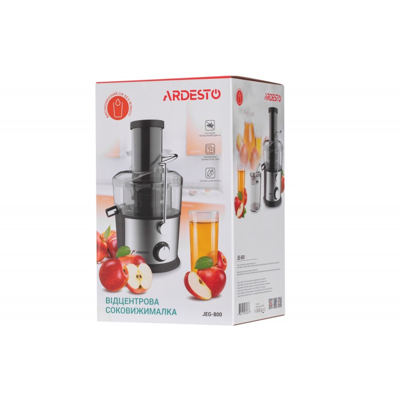 Зручність використання соковичавниці ARDESTO JEG-800 зумовлена кількома особливостями конструкції. Зокрема, аби пристрій непохитно стояв на поверхні, передбачено протиковзкі гумові ніжки. Задля безпеки модель оснащено додатковим запобіжним руків’ям і захистом від перегрівання двигуна.
