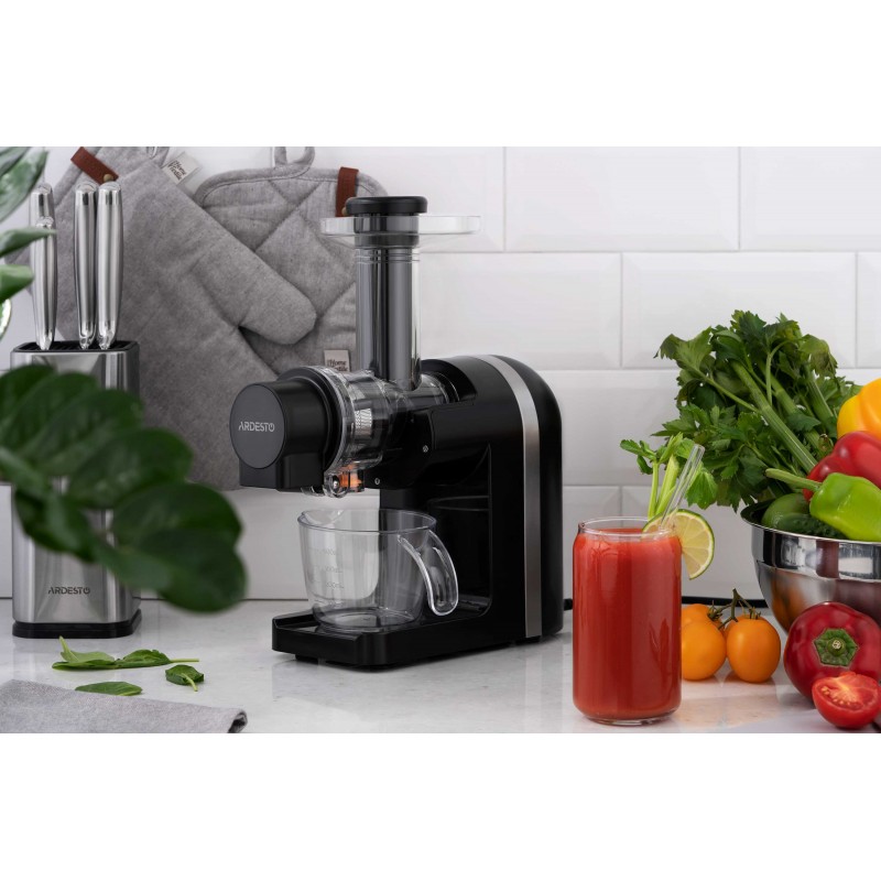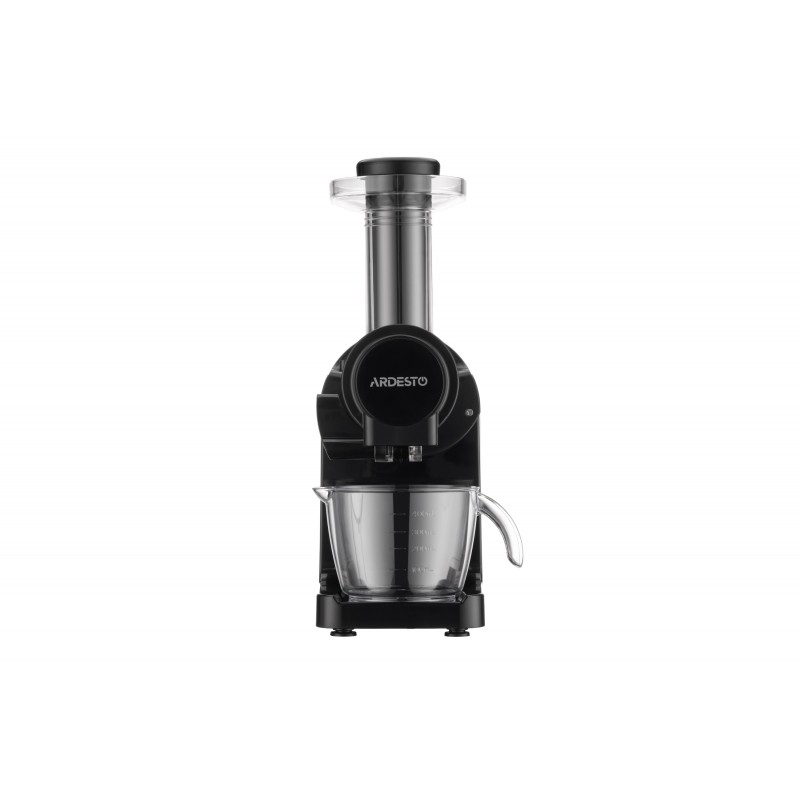 Модель у чорному пластиковому корпусі має металеві елементи, що елегантно доповнюють загальний дизайн. Комплектовання разом із пристроєм містить два контейнери: для соку об’ємом 400 мл і більш ємний (700 мл) для м’якоті. Під час подрібнення інгредієнти поділяються на сік і вичавки за допомогою сітчастого фільтра: сік проходить через фільтр і потрапляє до однієї чаші, вичавки – до іншої. Також доступна функція реверса. Всі пластикові елементи ARDESTO JEG-1500S вироблено з тритану, що не містить шкідливих для здоров’я речовин, зокрема BPA.