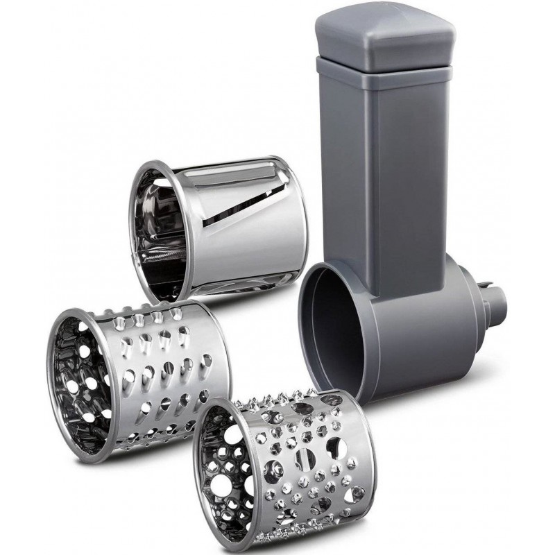 3 барабани для грубого та дрібного нарізання і шаткування входять до комплекту: готуйте свіжі овочеві салати та гарніри кожного дня без жодних зусиль; 2 решітки з нержавіючої сталі для різних типів перемелювання залежно від страви - середнє або грубе. Насадка для ковбас допоможе приготувати домашні сосиски та зекономить вам час.