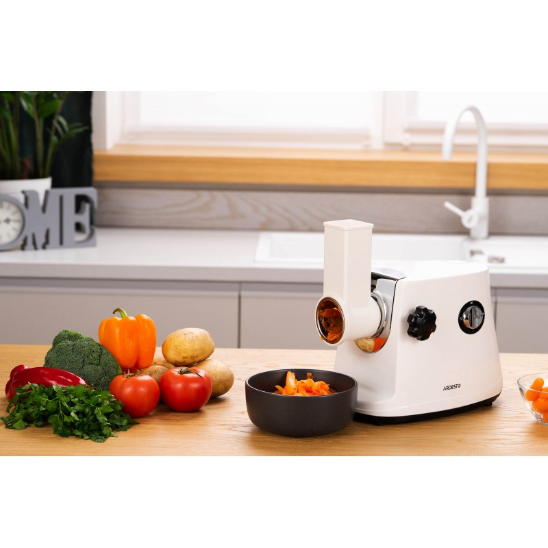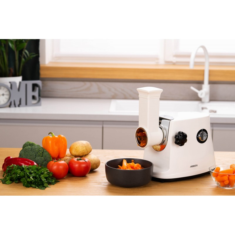- Комплектовання: насадки для приготування домашніх ковбасок і кеббе, дві тертки (дрібного та великого помелу), насадка для шаткування, штовхач