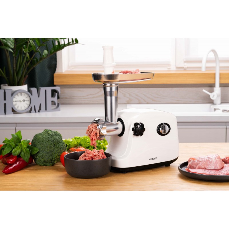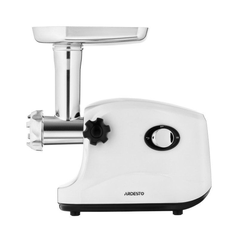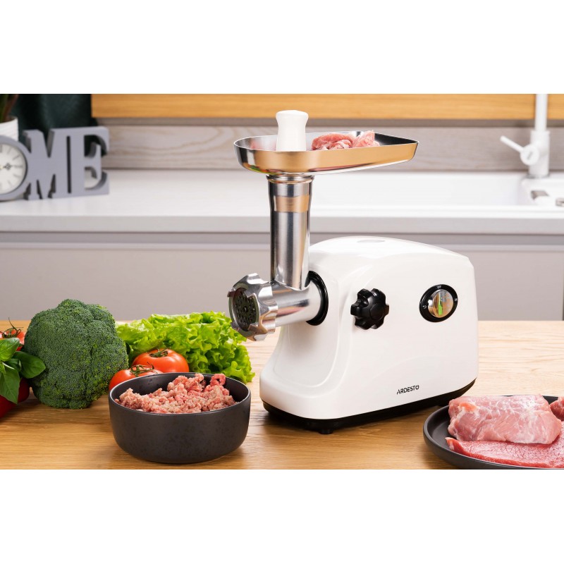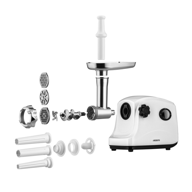 ARDESTO М'ясорубка, 1600Вт, 1.6кг/хв, 3 решітки, насадка для ковбас, кеббе, пластик, білий