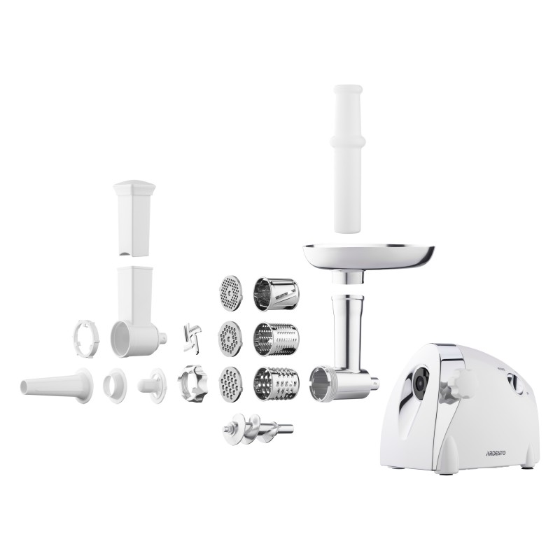 ARDESTO М'ясорубка, 2000Вт, продук.-1.9кг/хв, 3 решітки + для ковб., кеббе, 3 терки, пластик, біло-сріблястий