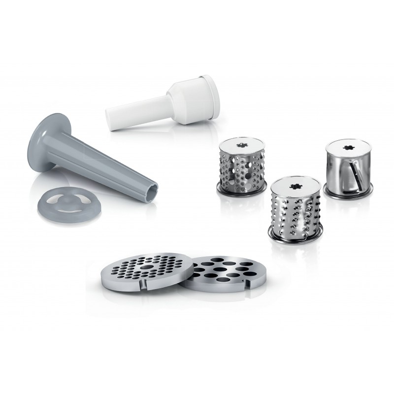 Комплектація диски: 3,8 / 8 мм, насадка для приготування домашніх ковбасок, шатківниця з 3 циліндричними терками, місткий завантажувальний лоток, штовхач