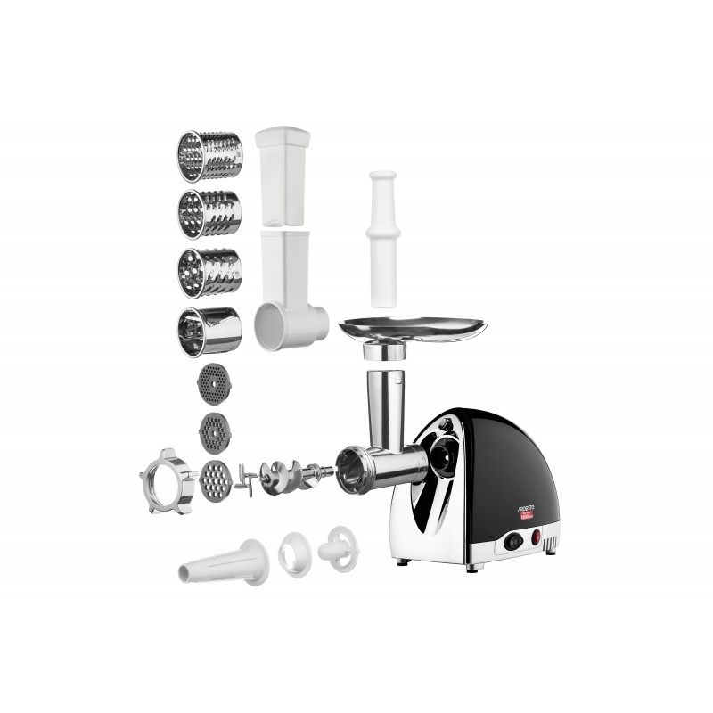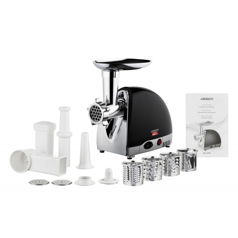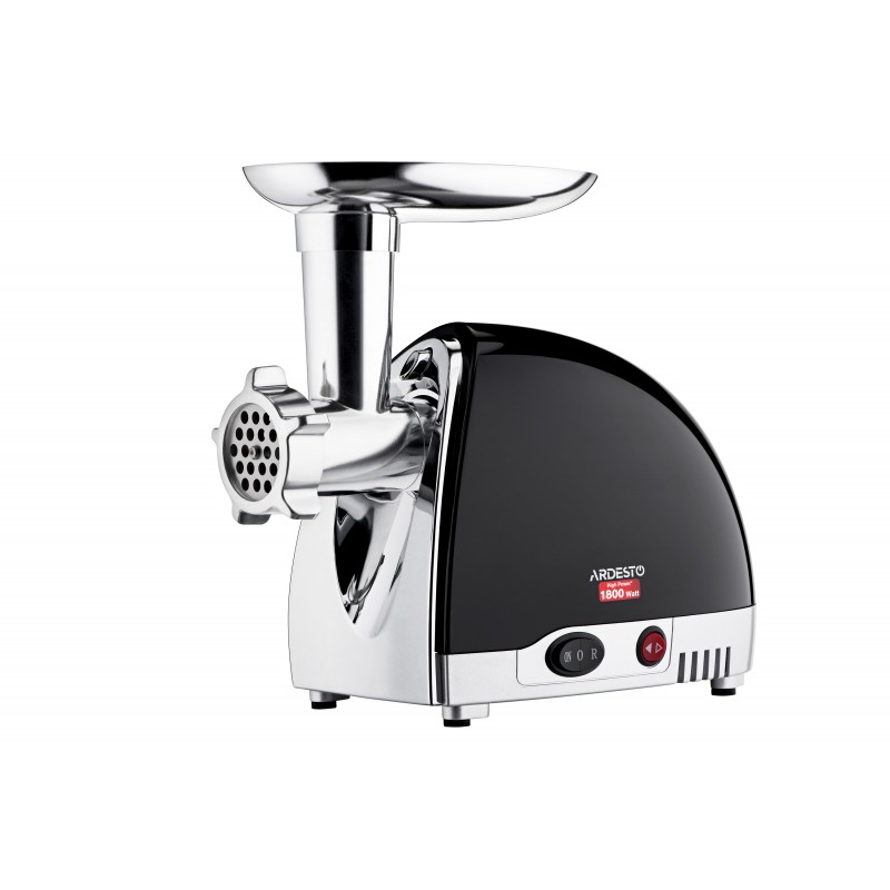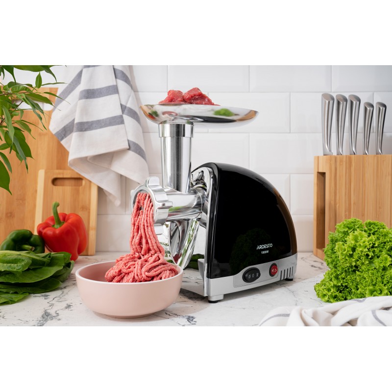 ARDESTO М'ясорубка, 1800Вт, продук.-2кг/хв, 3 решітки + для ковб., кеббе, 4 терки, пластик, чорно-сріблястий