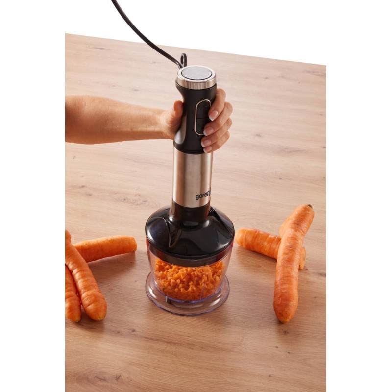 Блендер укомплектований насадкою з нержавіючої сталі для приготування пюре, супів або смузі. Насадка для збивання ідеальна для кремів чи яєць, а чопер із чашею 500 мл легко подрібнює тверді продукти.
