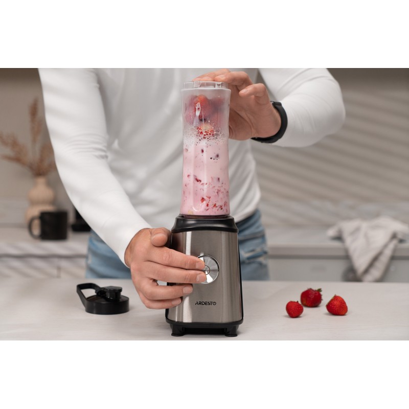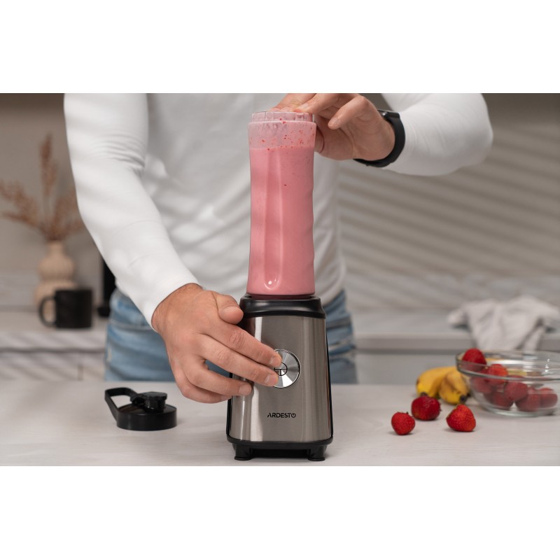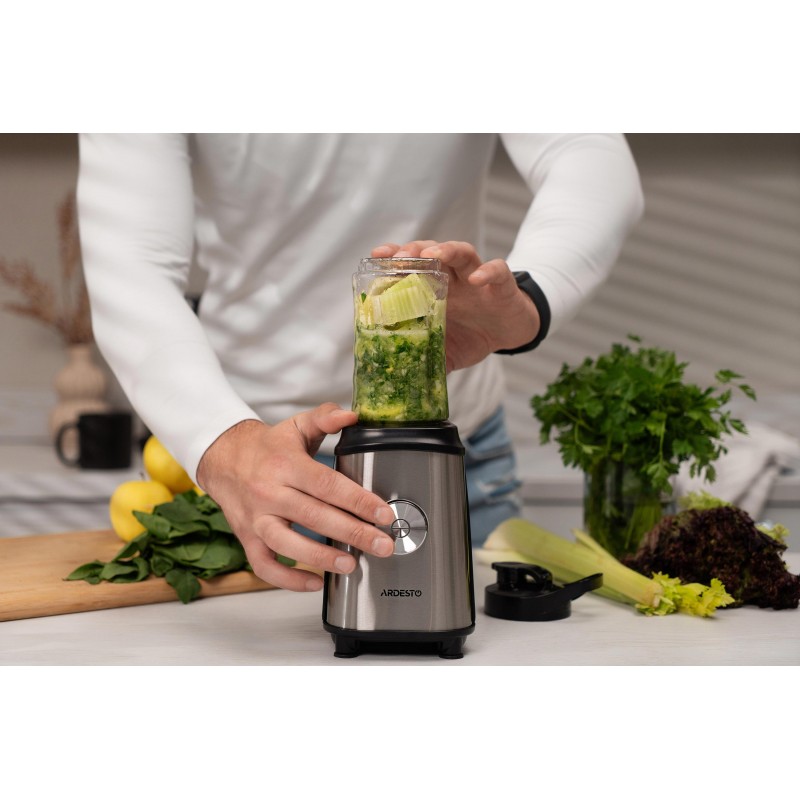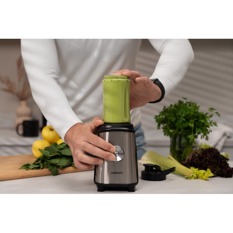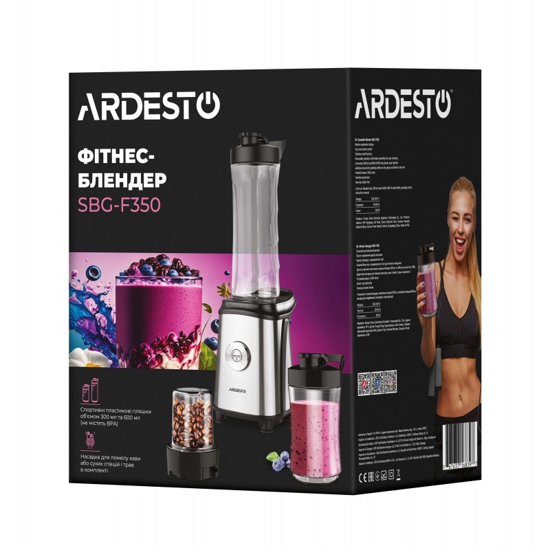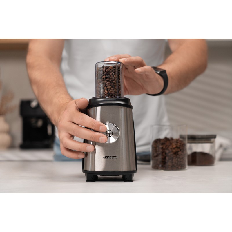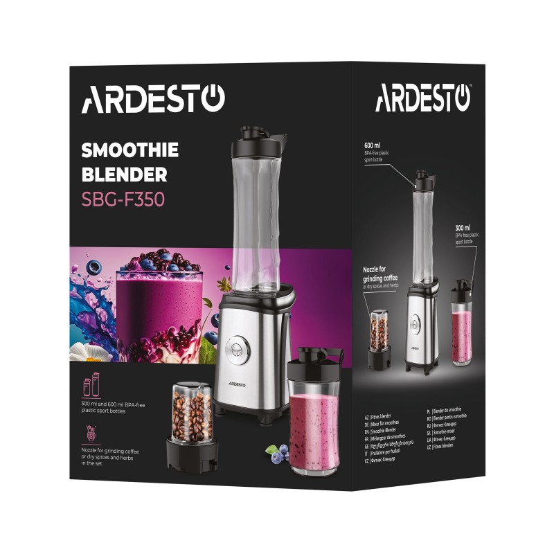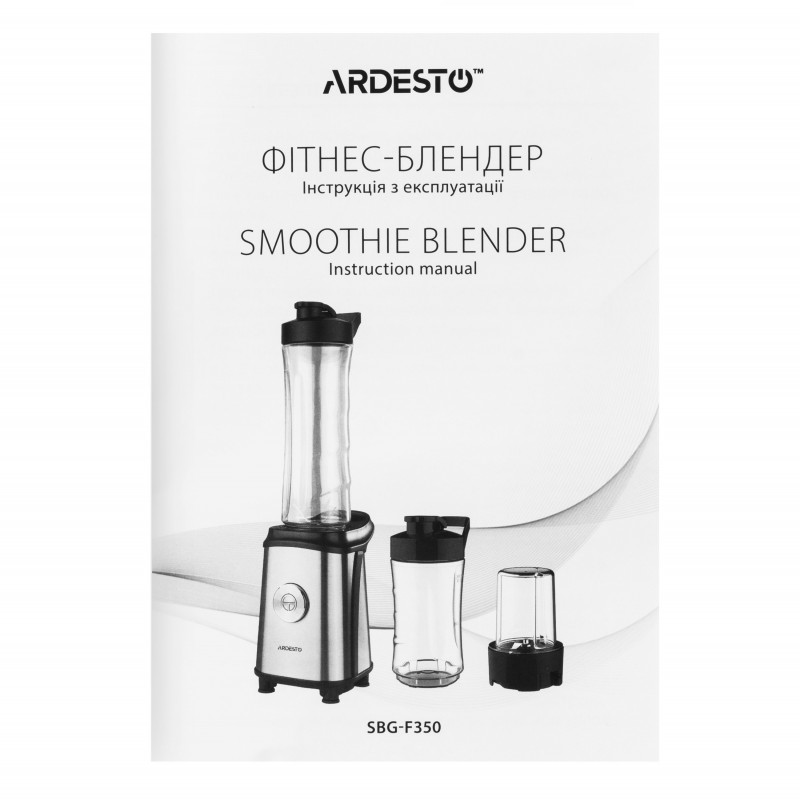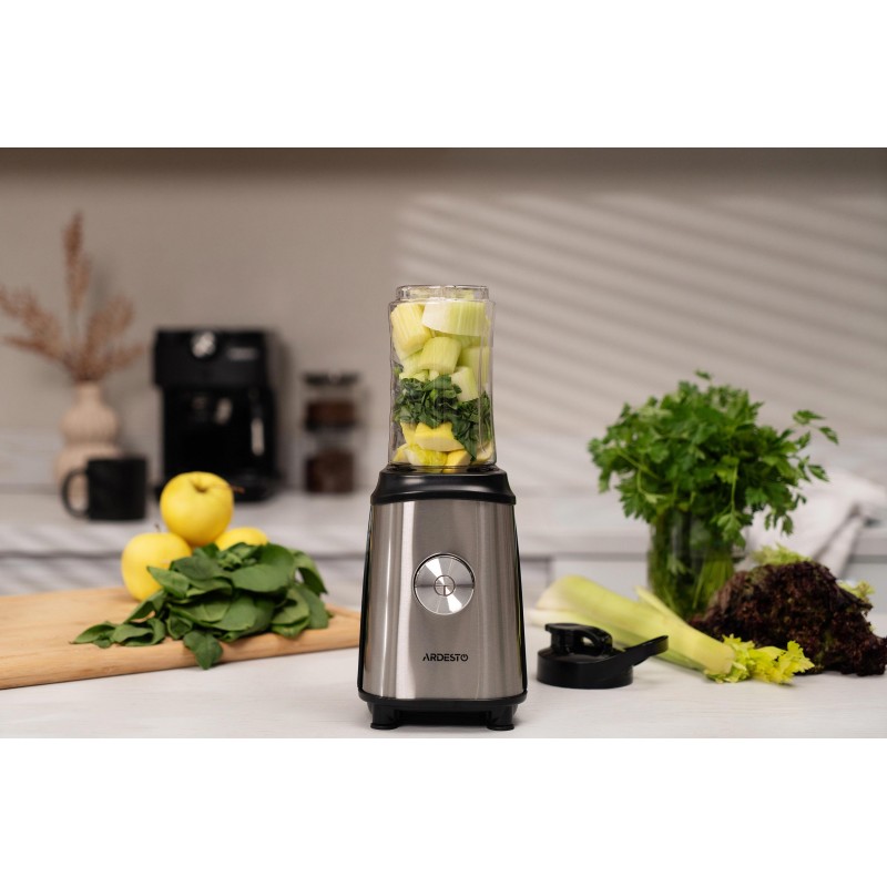 Блендер для смузі Ardesto SBG-F350, 350Вт,2в1, пляшка -600мл, пляшка -300 мл, кавомолка , чорно-сріблястий