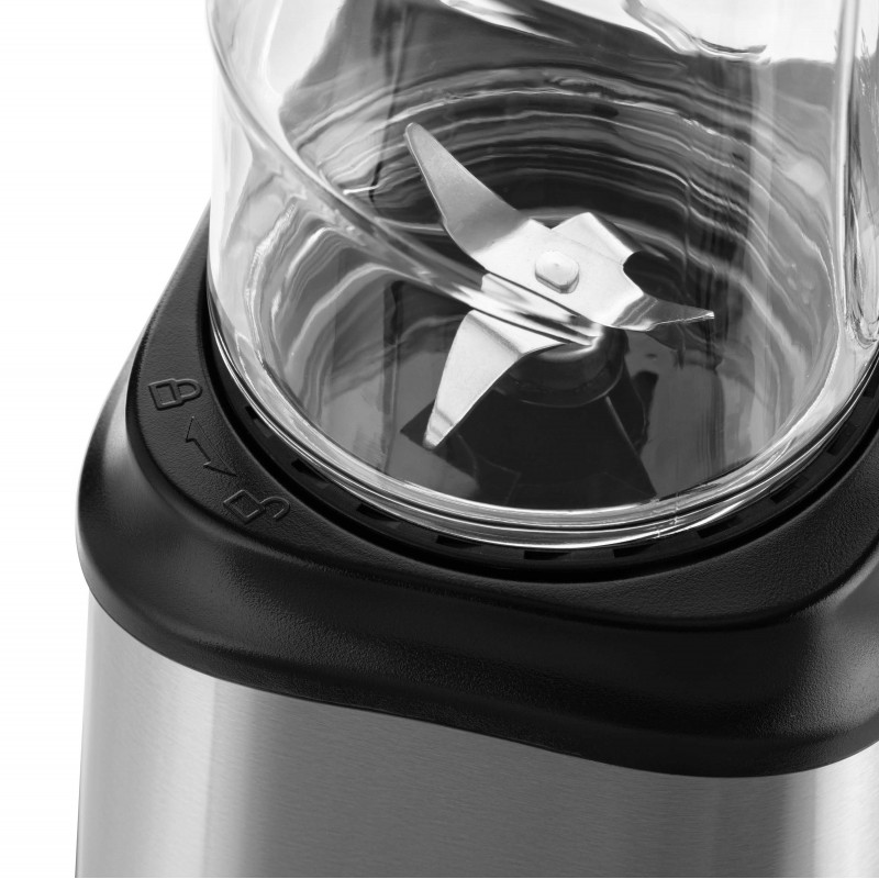 Передбачено знімний блок лез із нержавіючої сталі для легкого очищення. У комплектованні наявні зручні спортивні пластикові пляшки об’ємом 300 мл та 600 мл (не містять BPA), а також додаткова насадка для помелу кави або сухих спецій і трав в комплекті. Нековзні гумові ніжки забезпечують стабільність під час користування блендером. Пристрій захищено від перегрівання.