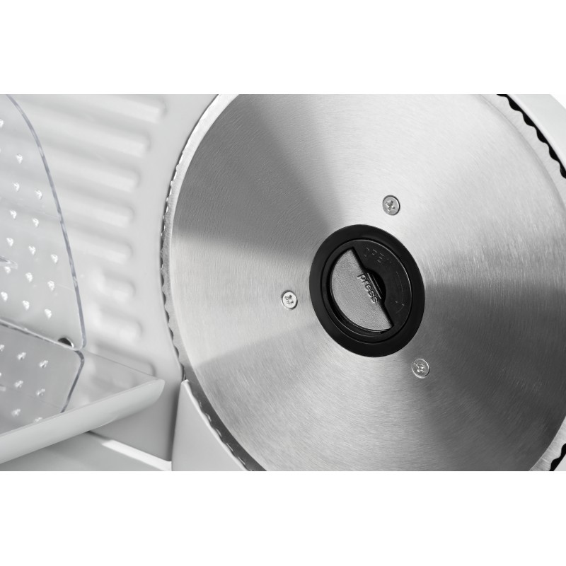 Стальне лезо з діаметром 190 мм отримало серрейторну заточку для більш ефективного нарізання продуктів. Налаштування товщини нарізання від 1 до 15 мм відбувається за допомогою зручного важеля з позначками. Для безпечного користування, клавіша увімкнення доповнена запобіжником. Пластиковий стіл для продуктів отримав зручне кріплення з нахилом, металеве покриття, а також прижимний тримач із зубцями.