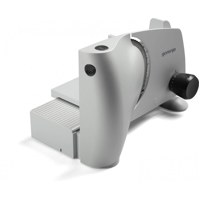 Слайсер оснащено системою безпеки для простого та безпечного нарізання. Щоб працювати з приладом, спочатку використовуйте кнопку безпеки, а потім кнопку ввімкнення. Коли прилад не використовується, поверніть регулятор налаштування товщини до позначки «0», яка є безпечним положенням.