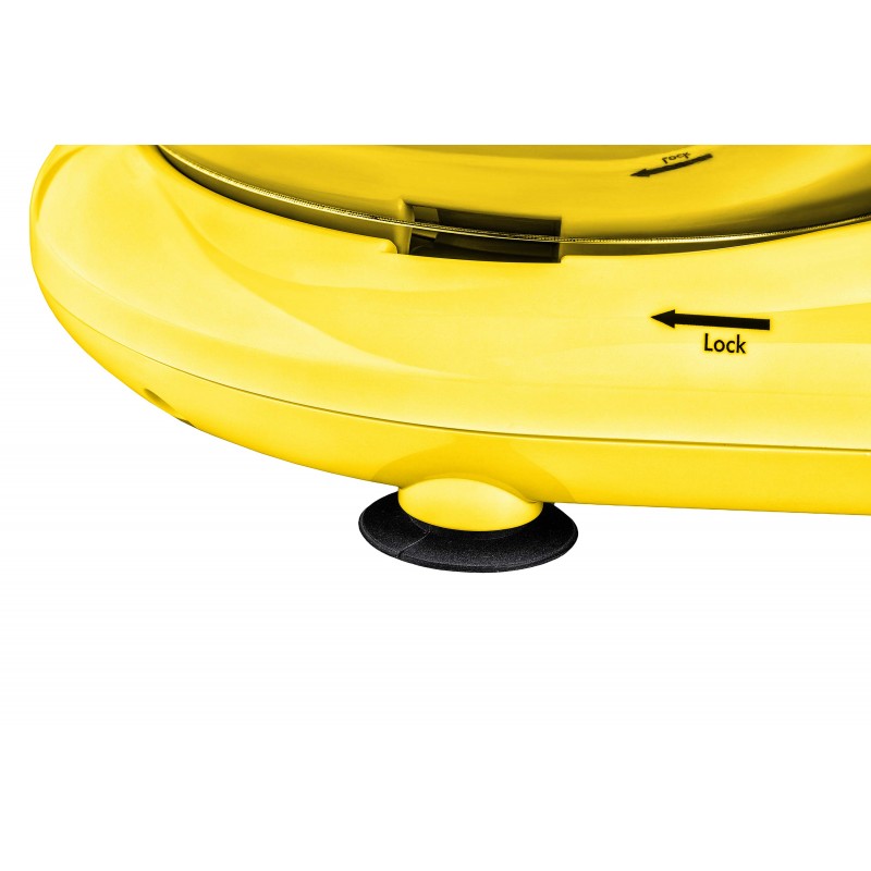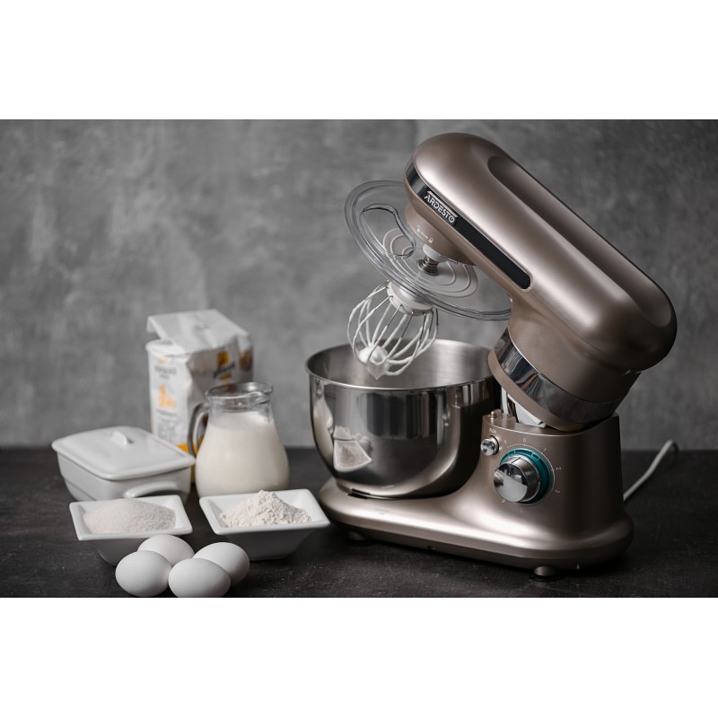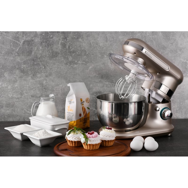 Чаша на чотири літри вироблена з нержавіючої сталі, а насадки – як з пластику, так і з металу. Вінчик та А-подібна насадка призначені для збивання крему та інших інгредієнтів з рідкою консистенцією, а гачок для замісу тіста. Прозора знімна кришка захищає від бризок, а для вилучення насадок є спеціальна клавіша. Двигун з потужністю 800 Вт захищено від перегріву, передбачено шість режимів швидкості, а також режим Pulse. Для керування використовується зручний важіль, а для стійкого встановлення є ніжки-присоски.