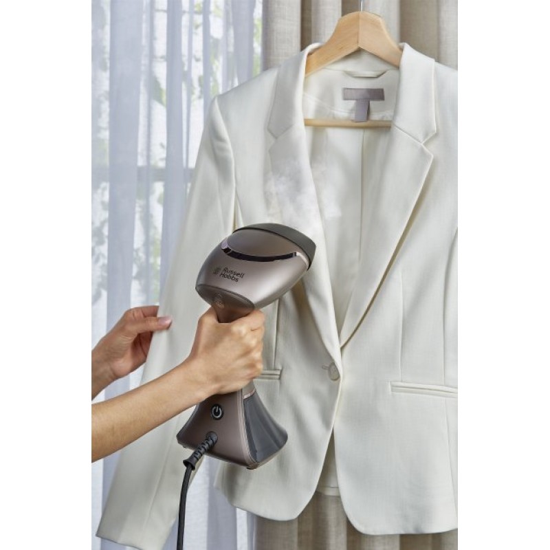 Ручний відпарювач Russell Hobbs Steam Genie Aroma 28040-56 має досить пристойні показники ефективності. Адже компактний прилад витрачає до 32 грамів пари в хвилину. При цьому швидкий час виходу на робочу температуру (всього 45 секунд) дозволяє вам приступити до роботи без зволікання. Керамічна пластина з підігрівом гарантує стабільні показники продуктивності і забезпечує комфортну і безпечну роботу без патьоків і крапель на поверхні тканини.