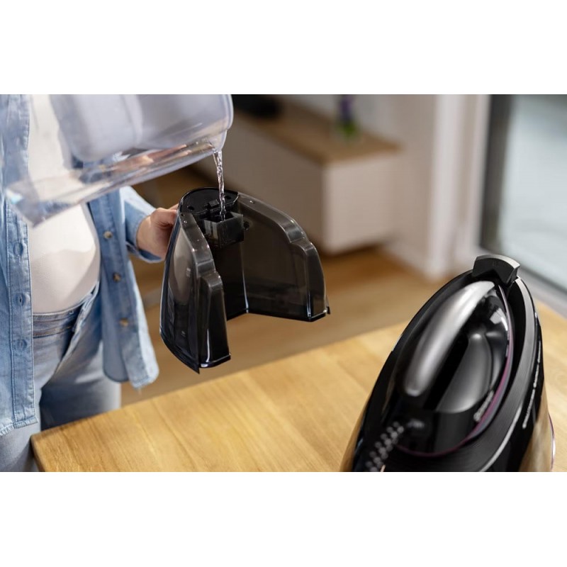 Легко знімний резервуар для води вміщує до 1,5 л, що вистачає на кілька годин прасування. Ніяких затримок через постійне доливання води. Резервуар виготовлений з легкого прозорого пластику, тому ви завжди бачите його вміст.