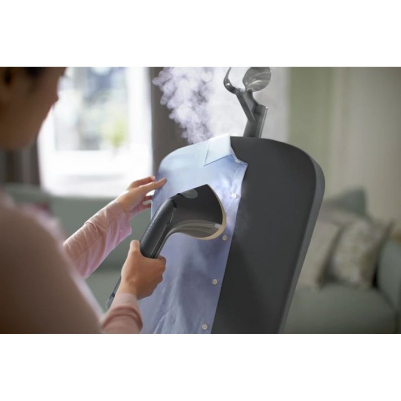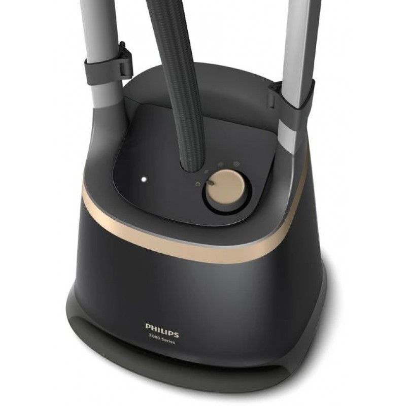 Витрачайте менше часу на прасування одягу з відпарювачем Philips Stand Steamer серії 3000 завдяки вбудованій дошці та відпарювачу з великим гострим наконечником. Захистіть свій одяг від бактерій* і додайте йому ароматної свіжості за допомогою відділення для ароматів MyEssence.