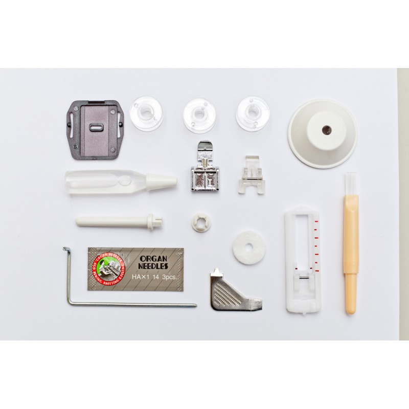 | Комплектація | Лапка для петлі, Лапка для вшивання блискавки, Набір голок, Універсальна лапка, Викрутка, Лапка для шиття, Лапка для пришивання ґудзиків, Направляючий для країв вистьобування, Шпульки, Додатковий тримач для котушки, Пластина для стержня котушки, Інструкція, Пензлик-розпорювач, Тримач котушки |