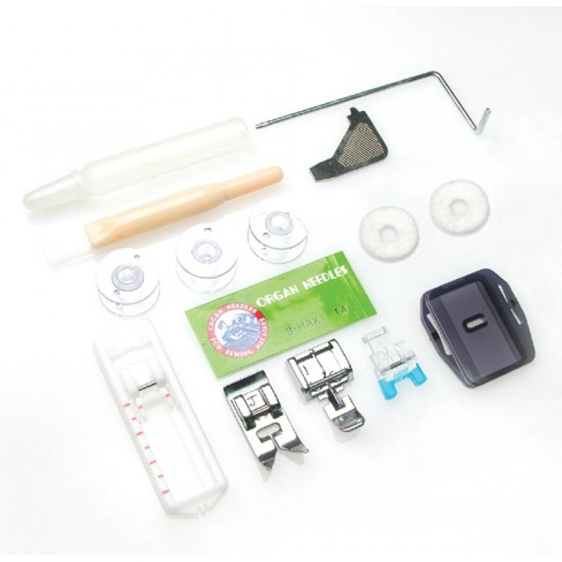 | Комплектація | Набір голок, Викрутка, Лапка для шиття, Лапка для пришивання ґудзиків, Шпульки, Додатковий тримач для котушки, Лапка для блискавок, Пластина для стержня котушки, Інструкція, Направляюча для країв, Пензлик-розпорювач, Тримач котушки |