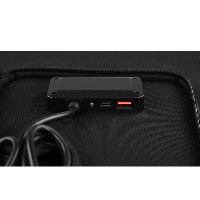 Модель потужністю 100 Вт вирізняється високим коефіцієнтом конверсії (22-23,5 %) та продуманою конструкцією: панель має дві секції, опори для встановлення під оптимальним кутом нахилу, зручні руків’я для легкого транспортування. Крім того, пристрій дійсно можна вважати мобільним: за ваги 2,9 кг у складеному стані має розмір 560 × 632 × 45 мм, тож не займатиме багато місця, наприклад, у баулі, тоді як у розкладеному – 1 265 × 560 × 25 мм. Також неспростовною перевагою моделі є багатство інтерфейсів. Панель оснащена рознімами DC, USB-A, USB-C і Anderson, що робить її придатною до використання з різними типами пристроїв і зарядними станціями. А технологія QC3.0 дасть змогу зарядити сумісний акумулятор до 50 % приблизно за 30 хвилин, при цьому автоматично визначаючи оптимальний рівень напруги, що максимізує ефективність заряджання. Вихідний постійний струм становить 12 В-20 В, 5 А (макс.).