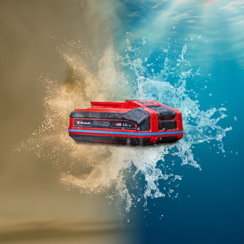 Акумулятор Einhell 18 V 4.0 Ah SEALED Power X-Change PLUS є частиною багатофункціональної системи акумуляторів Power X-Change від Einhell. Універсальні акумулятори Power X-Change забезпечують потужність і витривалість для всіх бездротових електроінструментів у всій сімействі продуктів, що охоплюють сектор садів і майстерень. Особливість SEALED акумулятора? Його герметичний корпус означає, що він водонепроникний і пилонепроникний відповідно до класу захисту IP57. Завдяки інтегрованому захисту від короткого замикання через додатковий контакт на гнізді акумулятора система датчиків виявляє контакт з водою та вимикає електроніку. Це гарантує, що навіть якщо акумулятор повністю занурений у воду, він може продовжувати використовуватися, коли він висохне. Його літій-іонні елементи останнього покоління забезпечують на 100% більше потужності для максимальної продуктивності в усіх сферах застосування, а також на 13% більш компактний дизайн і 10% зниження ваги. Крім того, наша технологія PLUS забезпечує додаткову потужність для інтенсивних завдань. Акумулятор не страждає від ефекту пам'яті або саморозряду, як більшість акумуляторів, що означає, що він може забезпечити постійну високу потужність. Контрольована технологічним процесом система активного керування акумулятором ABS постійно контролює параметри акумулятора за допомогою вбудованого мікропроцесора. Це забезпечує максимальну безпеку, оптимальну продуктивність пристрою, максимальний час роботи та максимальний термін служби. Ви можете перевірити поточний стан заряду за допомогою 3-ступінчастого світлодіодного індикатора. Конструкція корпусу робить його стійким до корозії та механічних впливів. Гумове покриття надає акумулятору високий захист від ударів і забезпечує гарне захоплення. Завдяки поглибленій ручці його можна легко зняти з усіх пристроїв.