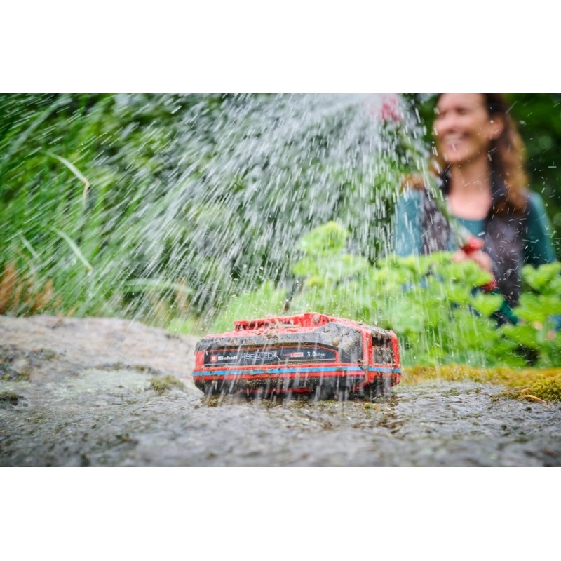 Акумулятор Einhell 18 V 3.0 Ah SEALED Power X-Change PLUS є частиною багатофункціональної системи акумуляторів Power X-Change від Einhell. Універсальні акумулятори Power X-Change забезпечують потужність і витривалість для всіх бездротових електроінструментів у всій сімействі продуктів, що охоплюють сектор садів і майстерень. Особливість SEALED акумулятора? Його герметичний корпус означає, що він водонепроникний і пилонепроникний відповідно до класу захисту IP57. Завдяки інтегрованому захисту від короткого замикання через додатковий контакт на гнізді акумулятора система датчиків виявляє контакт з водою та вимикає електроніку. Це гарантує, що навіть якщо акумулятор повністю занурений у воду, він може продовжувати використовуватися, коли він висохне. Його літій-іонні елементи останнього покоління забезпечують на 100% більше потужності для максимальної продуктивності в усіх сферах застосування, а також на 13% більш компактний дизайн і 10% зниження ваги. Крім того, наша технологія PLUS забезпечує додаткову потужність для інтенсивних завдань. Акумулятор не страждає від ефекту пам'яті або саморозряду, як більшість акумуляторів, що означає, що він може забезпечити постійну високу потужність. Контрольована технологічним процесом система активного керування акумулятором ABS постійно контролює параметри акумулятора за допомогою вбудованого мікропроцесора. Це забезпечує максимальну безпеку, оптимальну продуктивність пристрою, максимальний час роботи та максимальний термін служби. Ви можете перевірити поточний стан заряду за допомогою 3-ступінчастого світлодіодного індикатора. Конструкція корпусу робить його стійким до корозії та механічних впливів. Гумове покриття надає акумулятору високий захист від ударів і забезпечує гарне захоплення. Завдяки поглибленій ручці його можна легко зняти з усіх пристроїв.