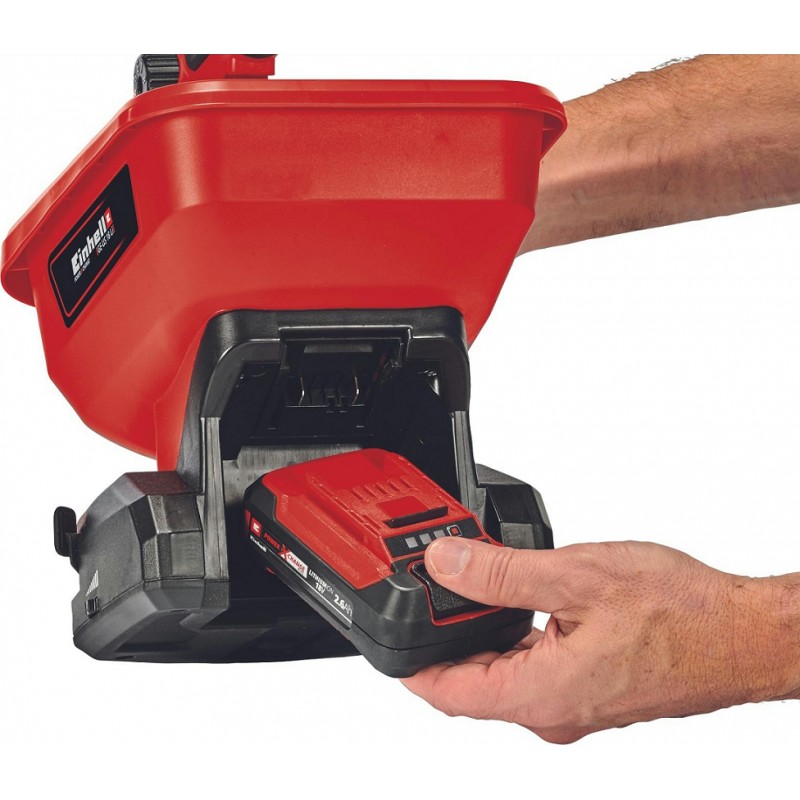 Розкидач є пристроєм сімейства Einhell Power X-Change. Батарея і зарядний пристрій Power X-Change можуть використовуватися для всіх пристроїв сімейства Power X-Change. 6-рівневий електронний регулятор швидкості та 8-рівневий ергономічний регулятор кількості розкидання забезпечують ідеально дозовану ефективність розкидання. Бак для насіння має ємність 3,3 літри.