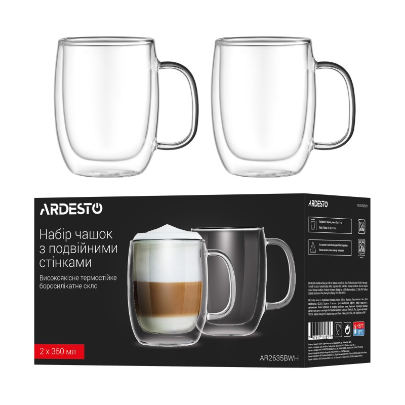 ARDESTO Набір чашок з ручками і подвійними стінками, 350мл, 2шт, боросилікатне скло, прозорий