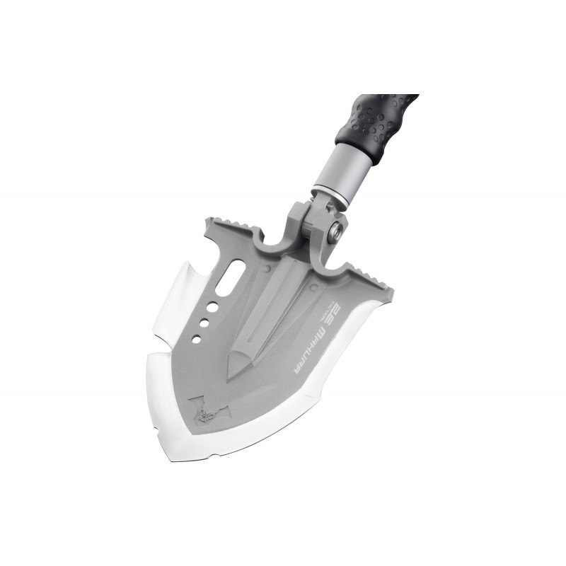 Лезо багатофункціональної ручної лопати 2E Mahura виготовлено з мартенситної нержавіючої сталі твердості 60 HRC із застосуванням технологій 100 % формування та лиття. Міцне та надійне руків’я з авіаційного алюмінію завтовшки понад 5 мм. За максимальної товщини 1,3 см лезо витримує навантаження понад 900 кг, до того ж не іржавіє навіть у солоній воді та не втрачає міцності за температури до -60 °C.