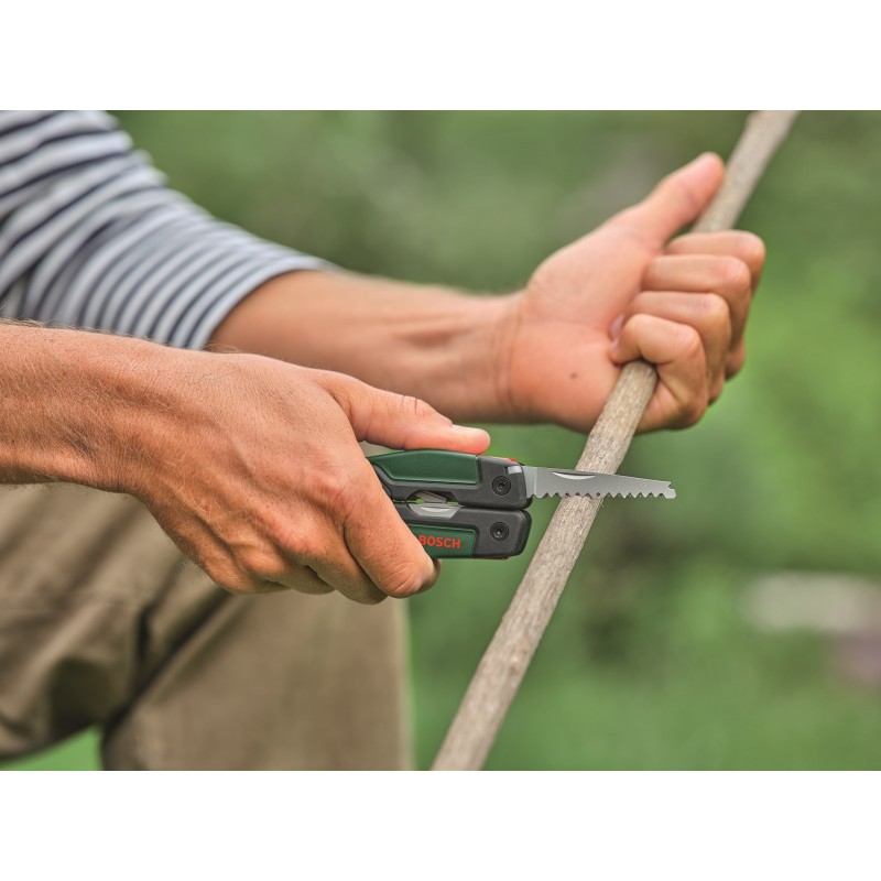 Він включає в себе кілька викруток, плоскогубці, бокорізи, пилку, ніж, ножиці, напилок, шило з петлею для різьби, відкривачку для пляшок/банок, зубочистку, пінцет і метричну лінійку, що робить його ідеальним для виконання домашніх завдань, кемпінгу та догляду за домашніми тваринами.